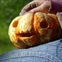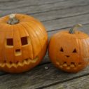 Co s obří dýní? Můžete ji jednoduše přeříznout na půl a vytvořit masku za každé poloviny tak, že řeznou plochou bude stát na zemi.